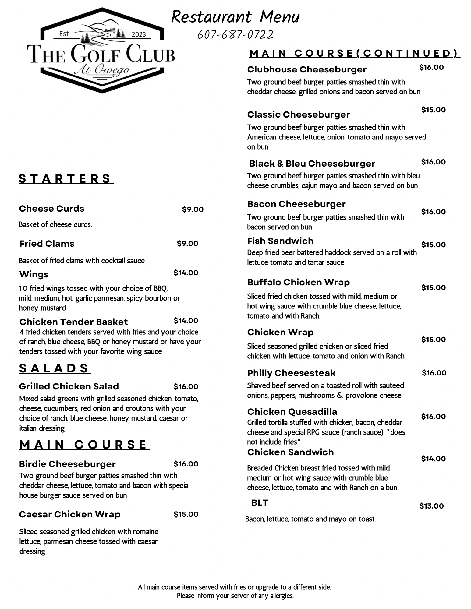 Round out your event at The Golf Club at Owego with delicious food from our clubhouse restaurant and full bar in Owego, NY. The Golf Club at Owego offers a catering menu that can be customized to fit our client’s needs. Take advantage of our custom on-site catering services for your...